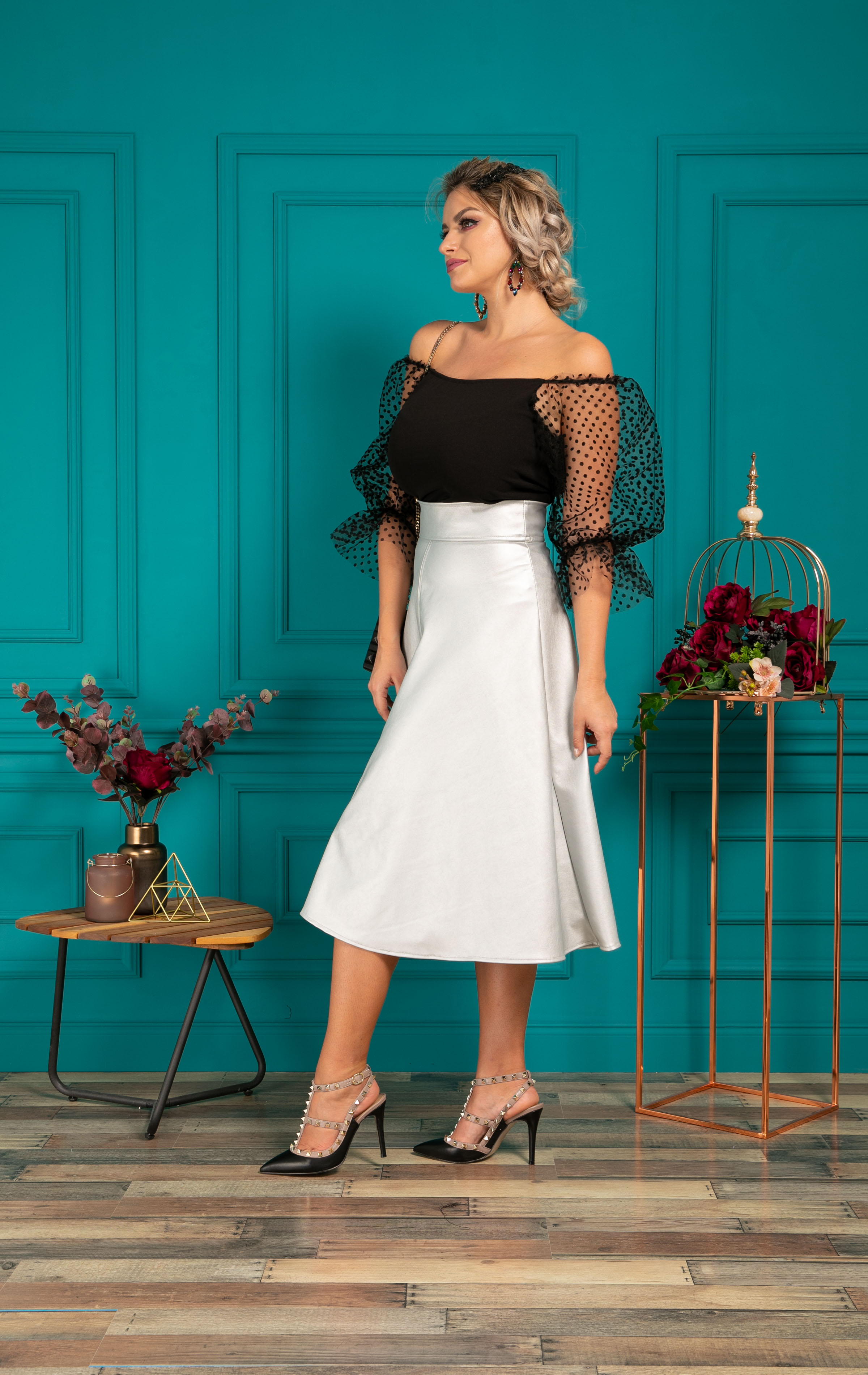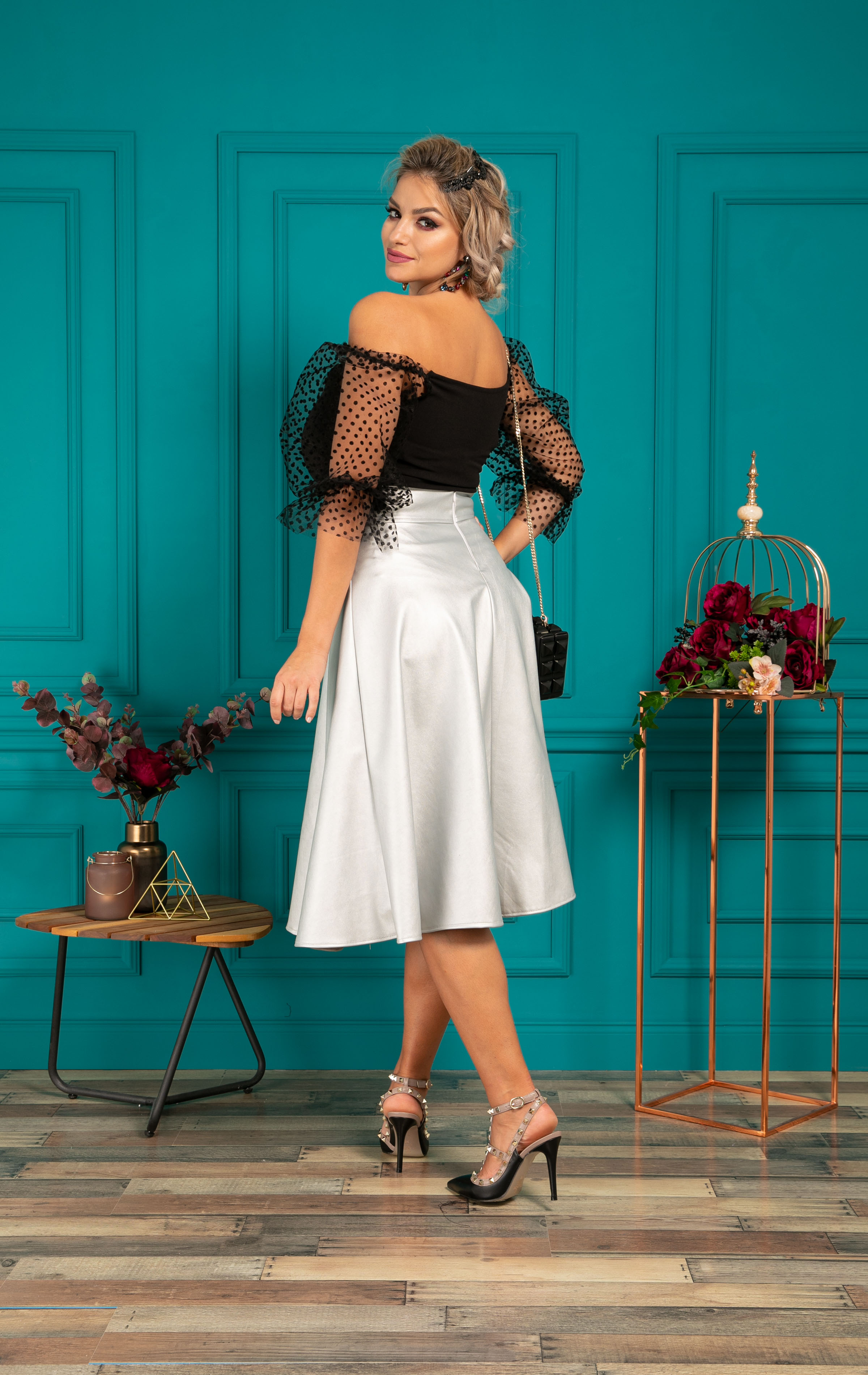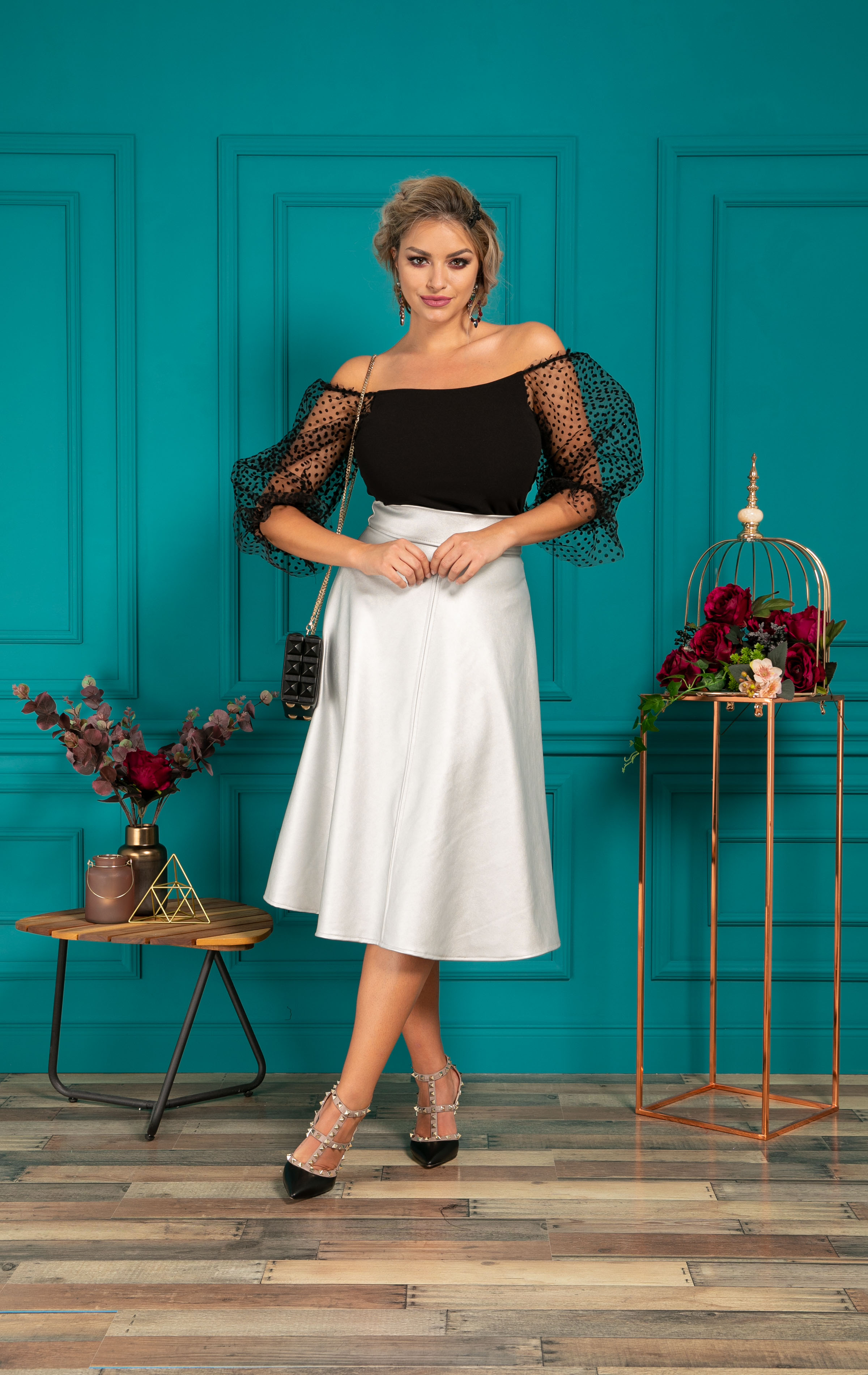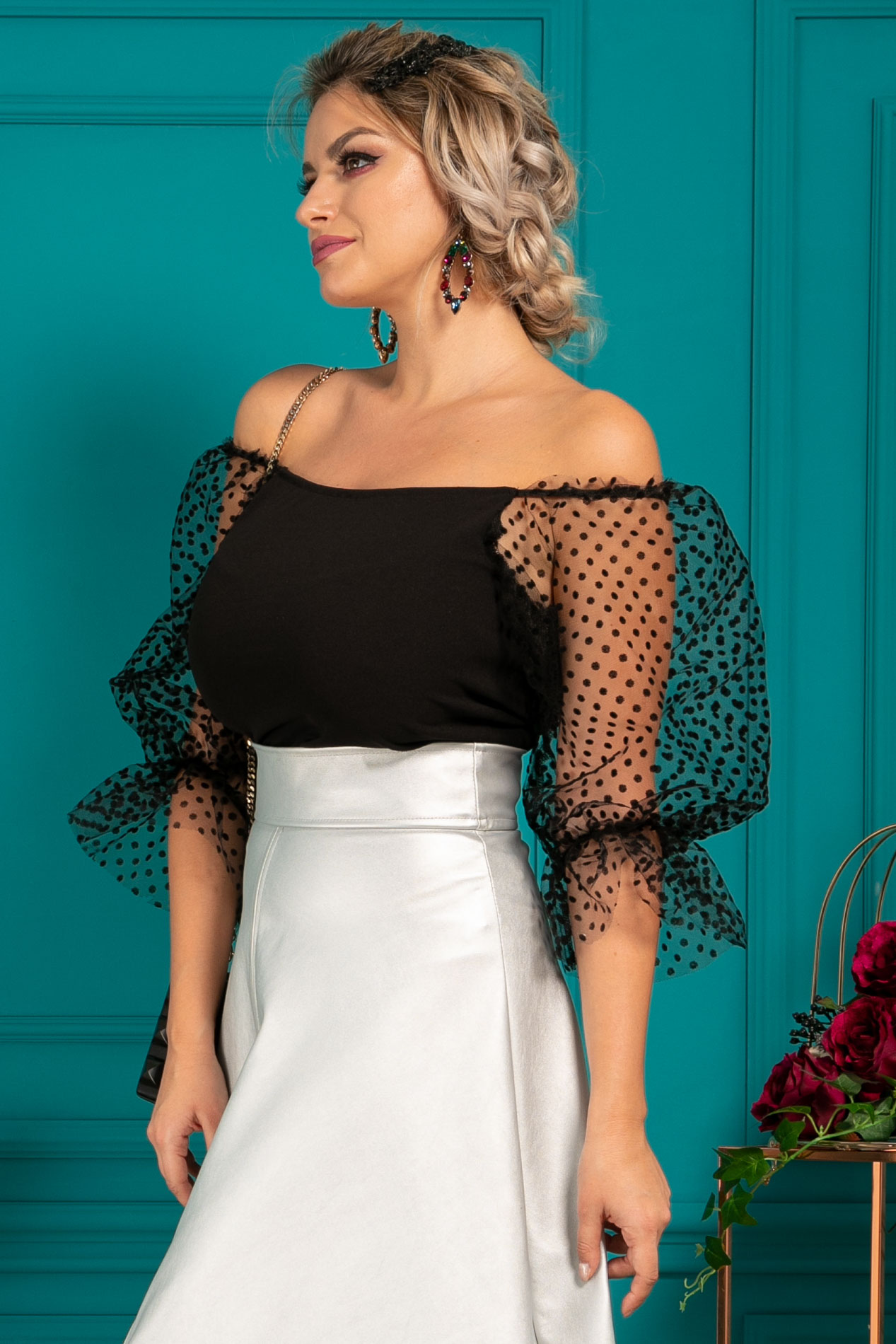 Material: Bluza- jerse elastic/ tul cu bulineFusta- Piele ecologica